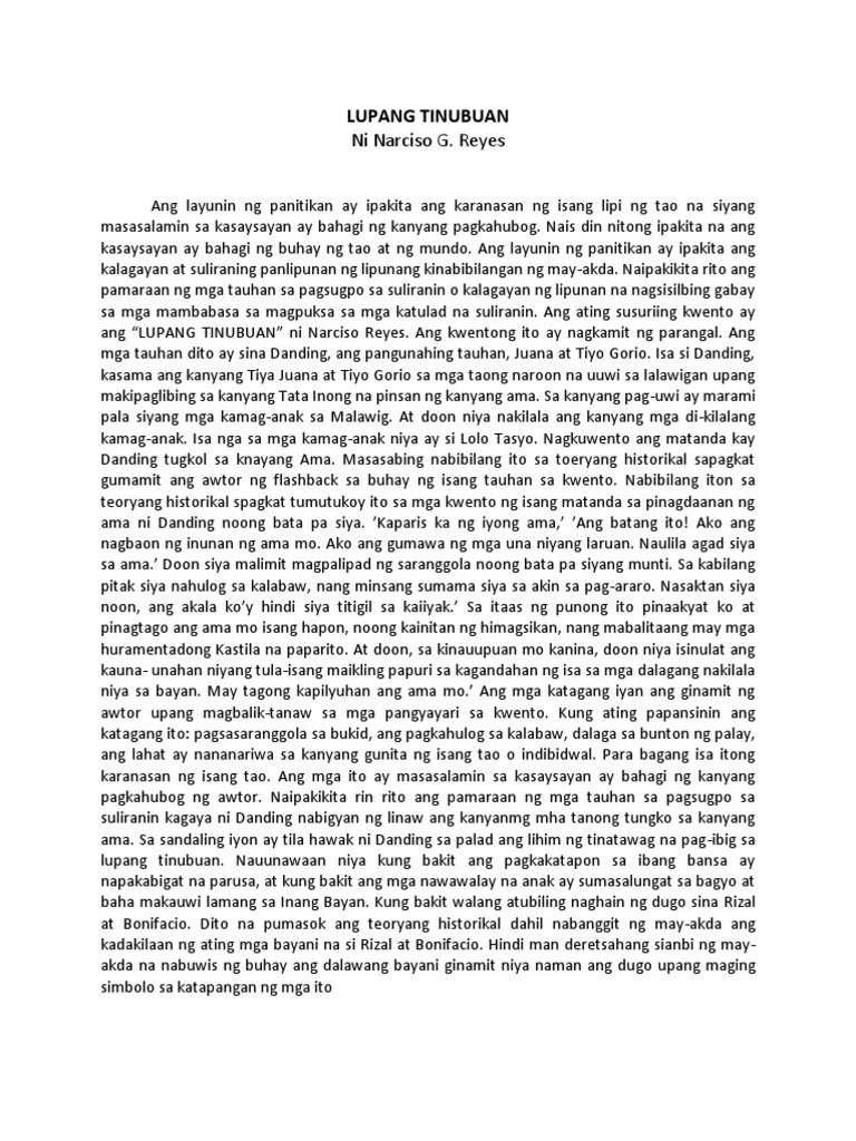 Lupang Tinubuan Ni Narciso Reyes Narito ang mga tagpuan sa maikling kuwentong Lupang Tinubuan. And selected works in English Author. Ano Ang Aral Na Ating Makukuha Sa Lupang Tinubuan.