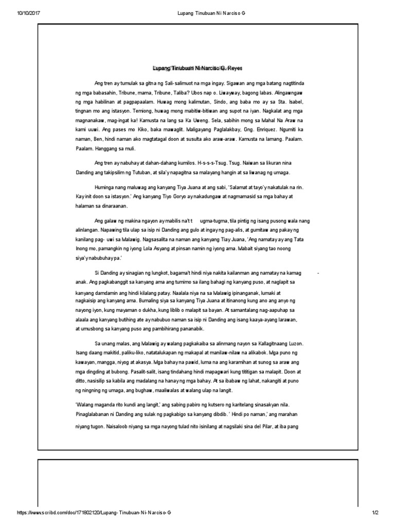 Lupang Tinubuan Ni Narciso G Reyes. Huwag mong kalilimutan Sindo ang baba mo ay sa Sta. Ang ating susuriing kwento ay ang LUPANG TINUBUAN ni Narciso Reyes.