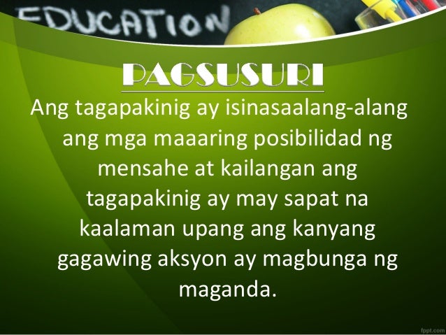 ANG PAKIKINIG AY MAY SINUSUNOD NA MGA HAKBANG 3. Ang tagapakinig ay iisipin ang kanyang mga naririnig. Kapag ang salita ay sinabi at ang tagapakinig ay walang problema sa pagdinig ang unang hakbang ay naisasagawa.
