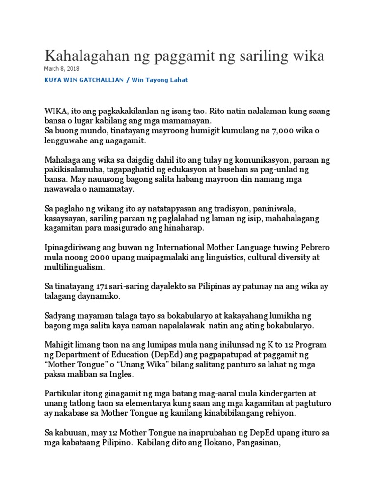 Kahalagahan Ng Paggamit Ng Sariling Wika