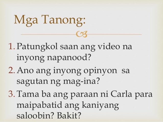 Ngayon na ikaw ay isang ina malamang na nakikita mo ang iyong mga magulang na naiiba kaysa noong maliit ka pa at hindi mo alam kung ano ang pagmamahal para sa isang bata. Subukang iproseso kung ano ang sinasabi ng ibang tao sa halip na tumango lamang. Isa itong tradisyong ginagawa ng mga Pilipino.