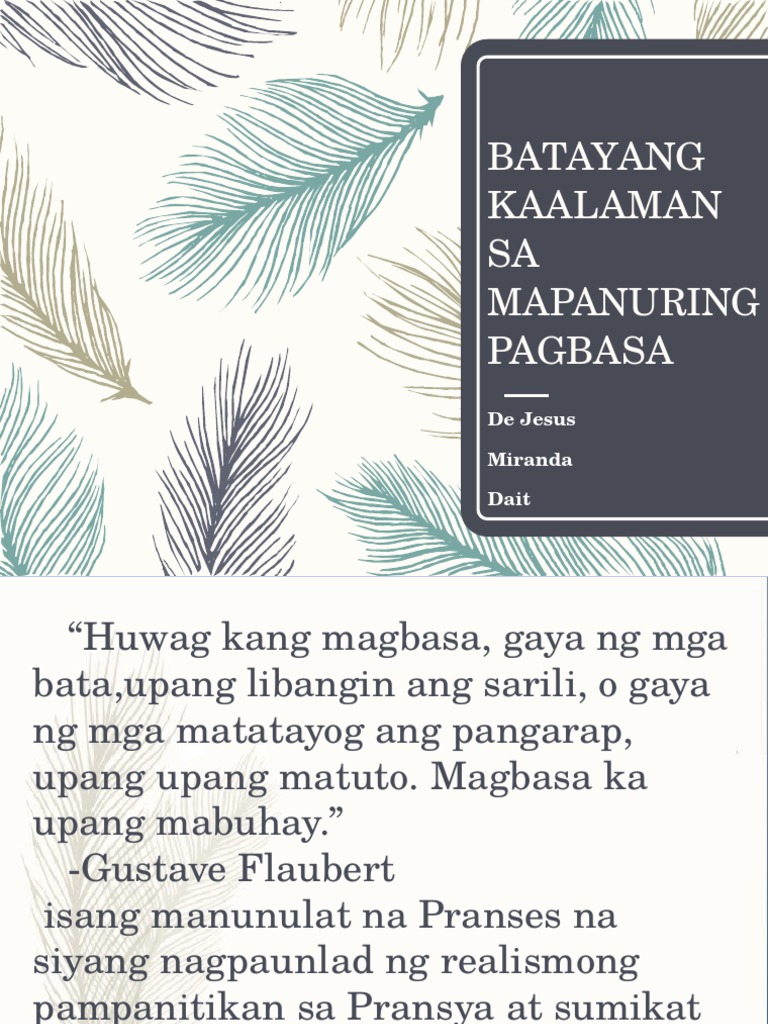Huwag kang magbasa gaya ng mga bata upang libangin ang sarili o gaya ng mga matatayog ang pangarap upang matuto. Huwag kang magbasa gaya ng mga bata upang libangin ang sarili o gaya ng mga matatayog ang pangarap upang matuto. GustaveFlaubert Huwag kang magbasa gaya ng mga bata upang libangin ang sarili o gaya ng mga matatayog ang pangarap upang matuto.