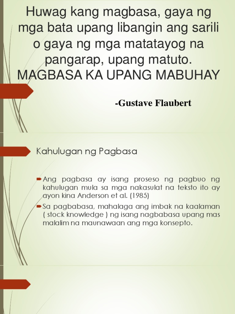 Huwag kang magbasa gaya ng mga bataupang libangin ang sarili o gaya ng mga matatayog ang pangarap upang upang matuto. Magbasa ka upang mabuhay - GUSTAVE FLAUBERT Kaalamang Pag-aaral ng Ponolohiya Katatasan Ponemiko Komprehesyon Bukabolaryo Ang pagbasa ay isang proseso ng pagbuo ng kahulugan mula sa mga nakasulat na teksto. Magbasa ka upang mabuhay.