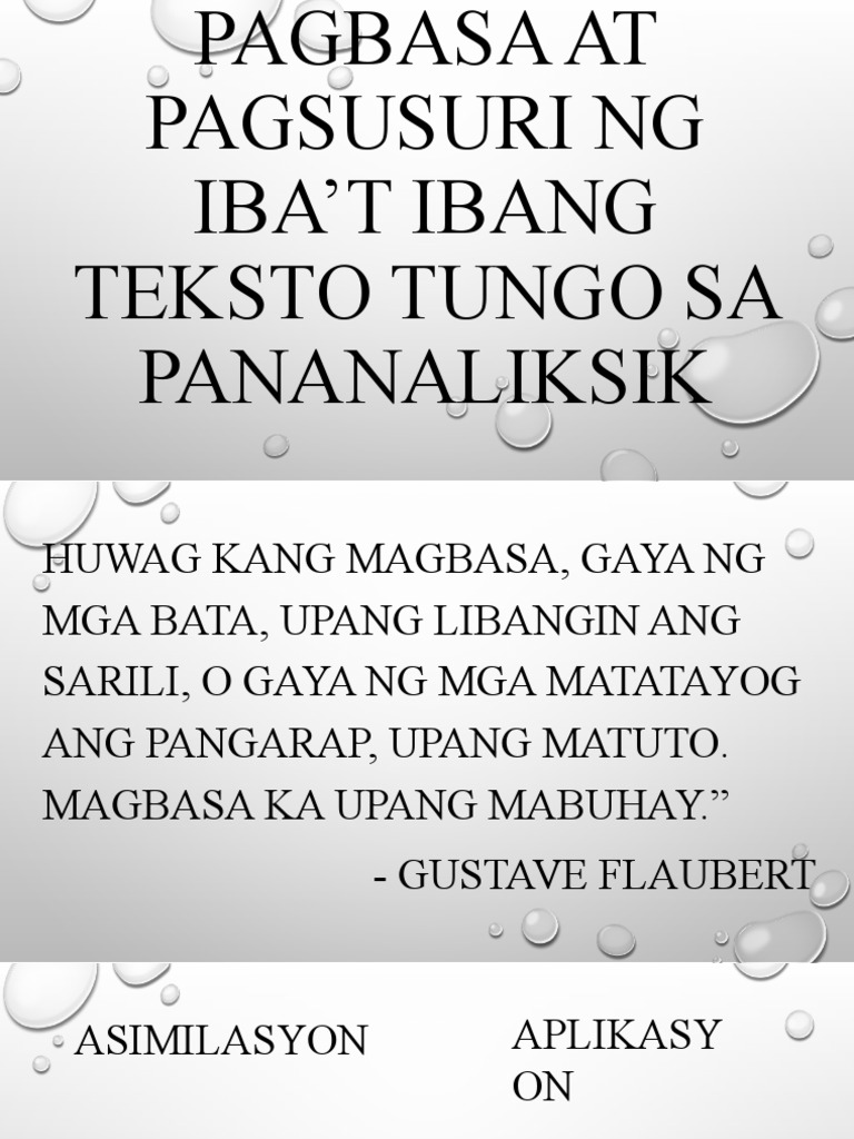 - Huwag kang magbasa gaya ng bata upang libangin ang sarili o gaya ng mga matatayog ang pangarap upang matuto. Magbasa ka upang mabuhay -Isang manunulat na Pranses na siyang nagpaunlad ng Realismong pampanitikan sa Pransya at sa kanyang akda na Madame Bovary 1857 Ano kaya ang ipinapahiwatig ni Gustave Flaubert. Sionil Jose - Mababaw ang sensibilidad ng mga Filipino dahil sa kawalan ng kultura ng pagbabasa pagbasa - proseso ng pagbuo ng kahulugan mula sa mga nakasulat na teksto.